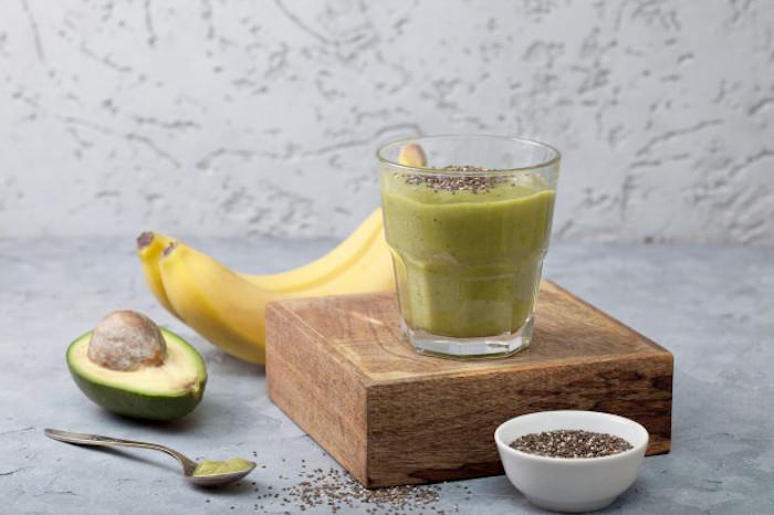 - Mixer l'avocat, les bananes, le beurre de cacahuète, le lait et les graines de chia.