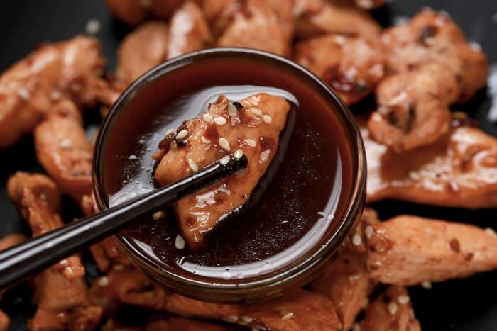 2. Dans un saladier, mélanger sauce soja, arôme Caramel et huile de sésame (vous pouvez ajouter une épice de votre choix) puis saler et poivrer. Laisser macéré le poulet pendant 1h