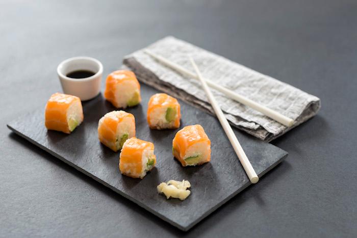 - Former des rectangles dans les tranches de saumon fumé. Hacher les chutes et les incorporer délicatement au riz tiède.